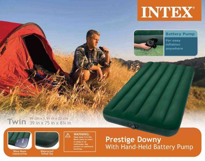 Кемпинговая надувная кровать с насосом 99 х 191 х 22 см. 66967 Intex- cерия престижных надувных кемпинговых матрасов. Плотный флокированный верх толщиной 0,52 мм и крепкие виниловые боковины и дно толщиной 0,38 мм делают надувные матрасы этой серии удачным выбором для путешествий с палаткой или на машине. Немаркий тёмно-зелёный цвет, флокированный верх и водоотталкивающий материал – основные характеристики надувных кемпинговых матрасов этой серии. Все кемпинговые матрасы этой серии комплектуются электрическим насосом, работающим от 6 батареек или аккумуляторов типа С.