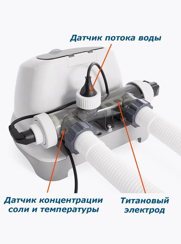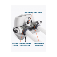 Хлорогенератор Krystal Clear Saltwater System Intex 26688 новая модель в компактном корпусе. Предназначен для обеззараживания воды и предотвращения ее цветения. Необходимая пропускная способность фильтра 2650-12112 л/час. Подходит для бассейнов до 32000 литров. В качестве реагента используется обычная поваренная соль, которую необходимо растворить в бассейне. Далее в процессе электролиза из нее выделяется свободный хлор, который не имеет запаха и не раздражает кожу или слизистую оболочку глаз. Система KRYSTAL CLEAR SALTWATER комбинирует в себе уникальную двухэтапную технологию для лучшего обеззараживания воды в бассейне. Когда Вы добавляете в воду обычную соль, за счет ее ионизации в хлоргенераторе (когда вода в процессе фильтрации проходит через покрытый титаном гальванический элемент) образуются ионы хлора. Эти ионы хлора совершенно безопасны для человека, совершенно им не ощущаются и в то же время являются смертельно губительными для различных микроорганизмов, которые заводятся и размножаются в любом открытом водоеме. В результате этого мы получаем новую, мягкую, очищенную воду без побочных химических элементов. С новым процессом ЭКО, молекулы воды расщепляются на очень мощные окислители, которые разрушают органические загрязнители, такие как бактерии и водоросли.