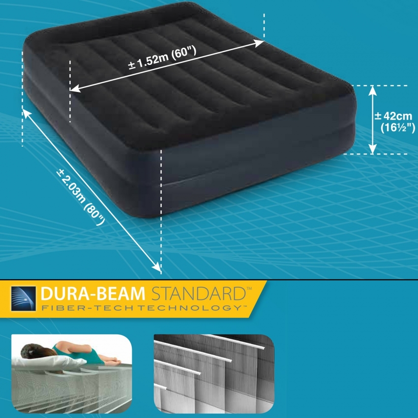 Предлагаемая надувная двуспальная кровать INTEX 64124 является отличным вариантом как для личного использования дома и на даче, так и мобильного спального места для гостей. Эта кровать является усовершенствованной моделью очень популярной кровати Intex 66702. Кровать получила новую структуру внутренних перегородок - Dura-Beam Construction, которая, в отличие от полос из ПВХ в предыдущей модели, состоит из тысяч параллельных высокопрочных полиэфирных волокон, не подверженных растяжению и более устойчивых на разрыв. Это придает кровати еще большую устойчивость к деформациям, благодаря чему такие надувные кровати послужат еще дольше. Возвышение у изголовья кровати не даст упасть подушке, когда Вы спите или вообще может заменить подушку. Верхняя часть имеет флокированное покрытие приятное на ощупь и предохраняющее от соскальзывания простыни. В случае загрязнения поверхность можно мыть теплой водой с мылом. Надувная кровать INTEX 64124 имеет встроенный электрический насос, благодаря которому можно быстро накачать и скачать кровать, когда это понадобится. Также с помощью этого насоса можно регулировать жесткость кровати.